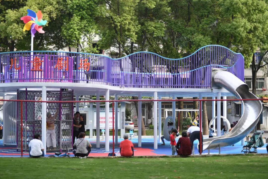刚一走进扬子社区,孩子们的欢声笑语就荡漾开来,转角视野变开阔,蓝紫相间的童趣游乐设施映入眼帘,上书“儿童剧场”四个大字。年龄不等的一群孩子活跃其间,溜滑梯、荡秋千、玩爬架,耍得不亦乐乎。