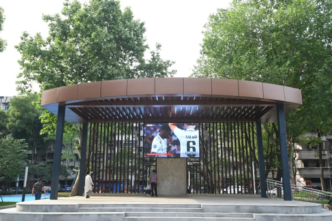 儿童游乐区旁边,新安装的户外电子屏上播放着最新的球赛,原有的社区舞台焕然一新,功能也完善了,舞台前还保留着开阔广场。