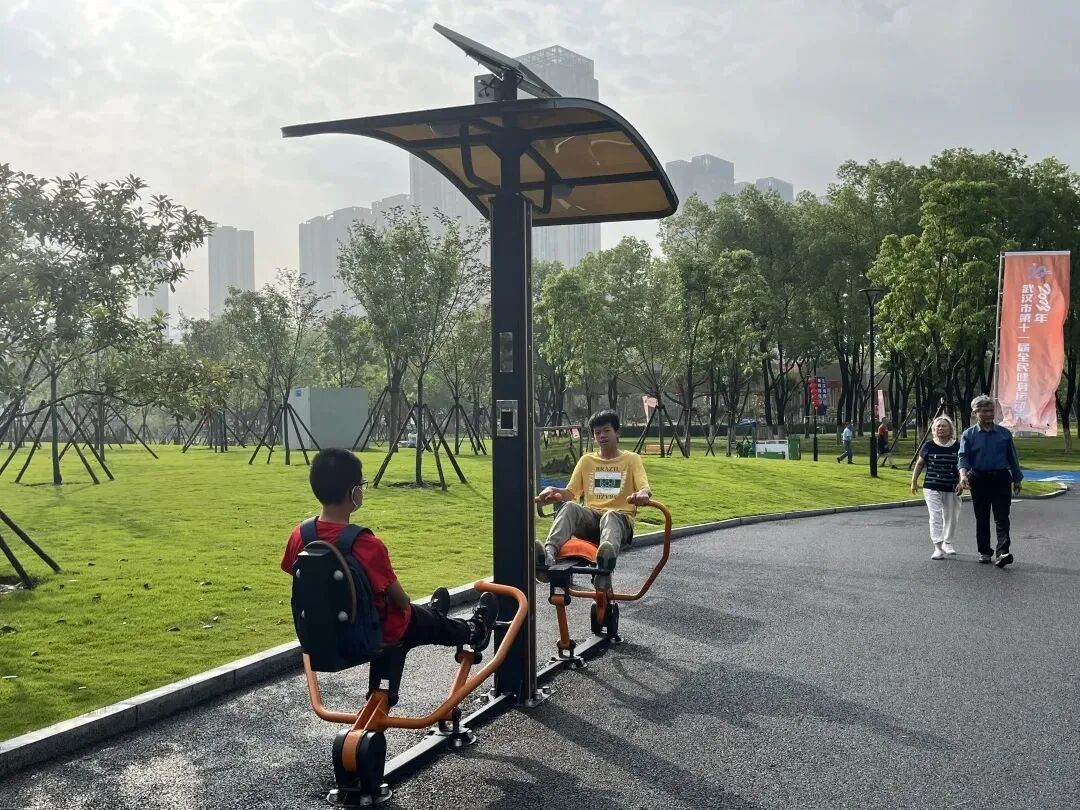 为支持本次的全民健身运动会,江汉区文化和旅游局(体育局)向园内投放大量新型健身器材。其中全民健身生态舱、动感单车、单双杠以及二代户外健身器材等都深受群众的欢迎。