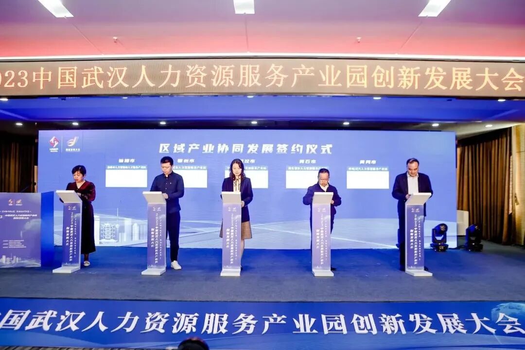 中国武汉人力资源服务产业园与黄石、鄂州、黄冈、仙桃人力资源服务产业园签署产业合作协议。