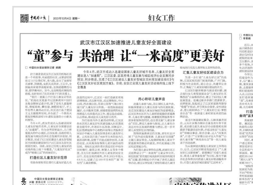 今年4月,武汉市成功入选建设国家儿童友好城市名单,儿童友好全面建设进入“加速期”。作为全市面积最小、人口密度最大的中心城区,江汉区委、区政府将儿童发展与城区经济社会发展同步规划、同步推进,完成了《江汉区建设儿童友好型城区空间规划建设指引》与《江汉区友好社区规划方案》。目前,全区已实现儿童友好活动场所线上线下全覆盖,“儿童友好社区”成为“精致江汉”的亮丽名片。