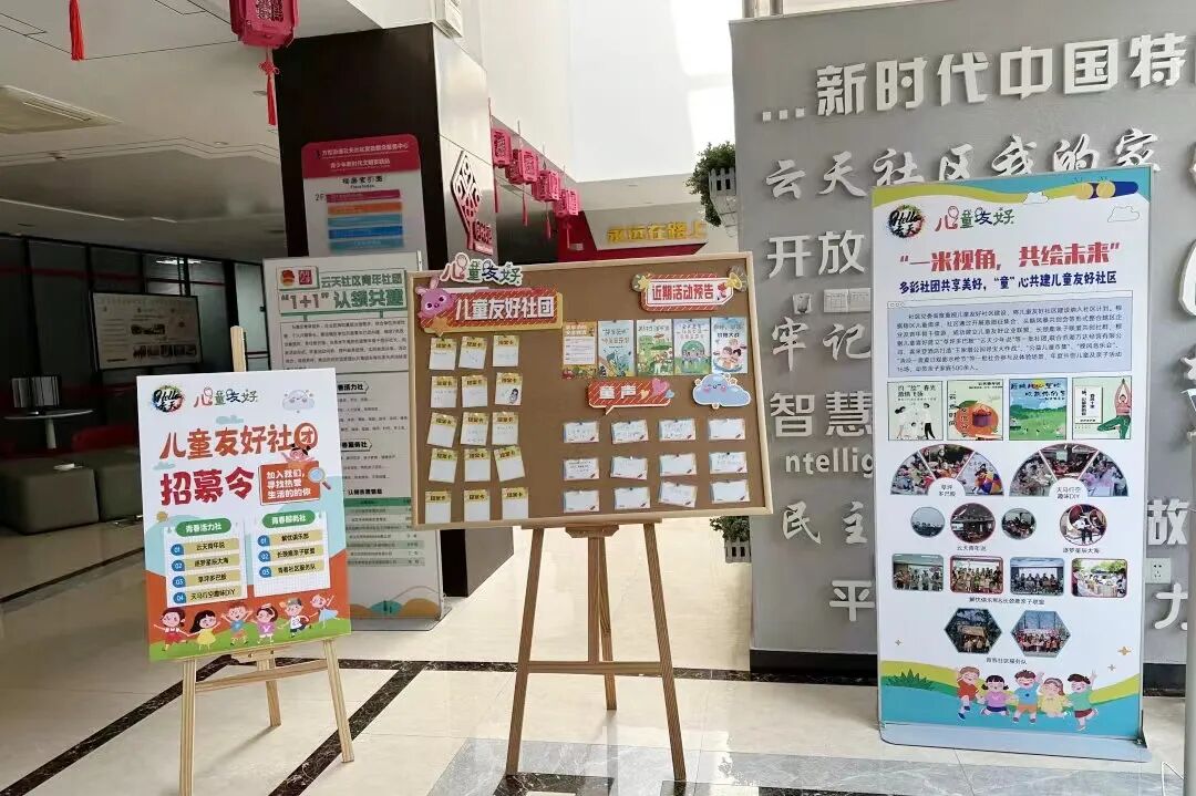 为打造室内外儿童活动阵地,江汉区各社区把儿童友好社区建设融入社区惠民资金使用中,在老旧小区改造、园林设计、社区党群服务中心提档升级等公共服务空间设计中融入儿童友好理念和儿童友好元素。云天社区打造了600平方米的室内儿童活动阵地,设置了开放式接待空间、儿童活动室、云天英语角等供儿童开展活动的空间。青松社区则在老旧改造项目中结合空间慢行、建筑立面、智慧人文等多个维度,全方位打造满足片区儿童及居民安全出行、互动交流的场所,并在2023年投入4.9万元,设置了近100平方米的“‘童’你有约”儿童涂鸦墙。