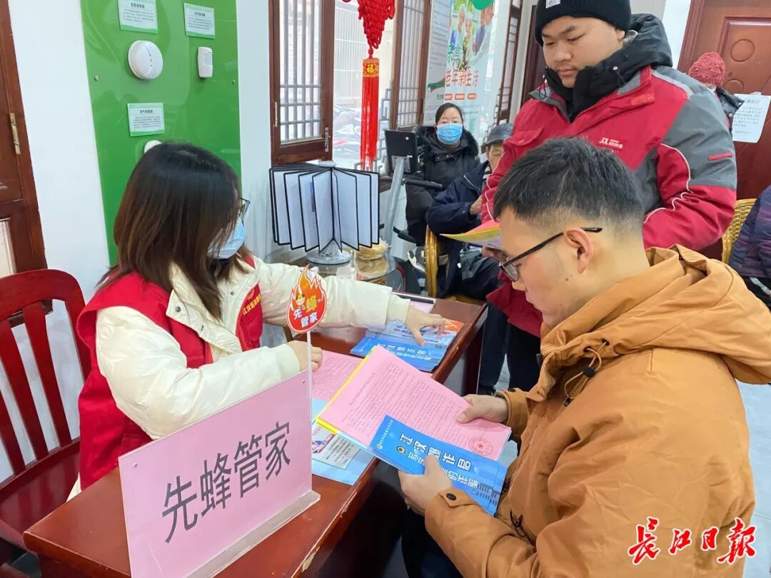 “先‘蜂’管家”正在领取政策传单。 记者李奥 摄
