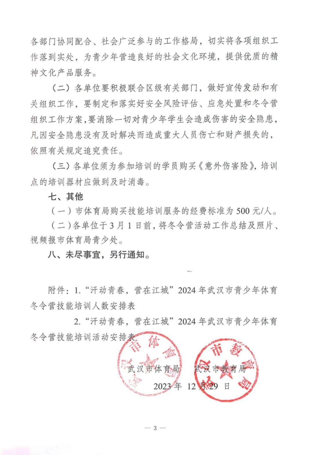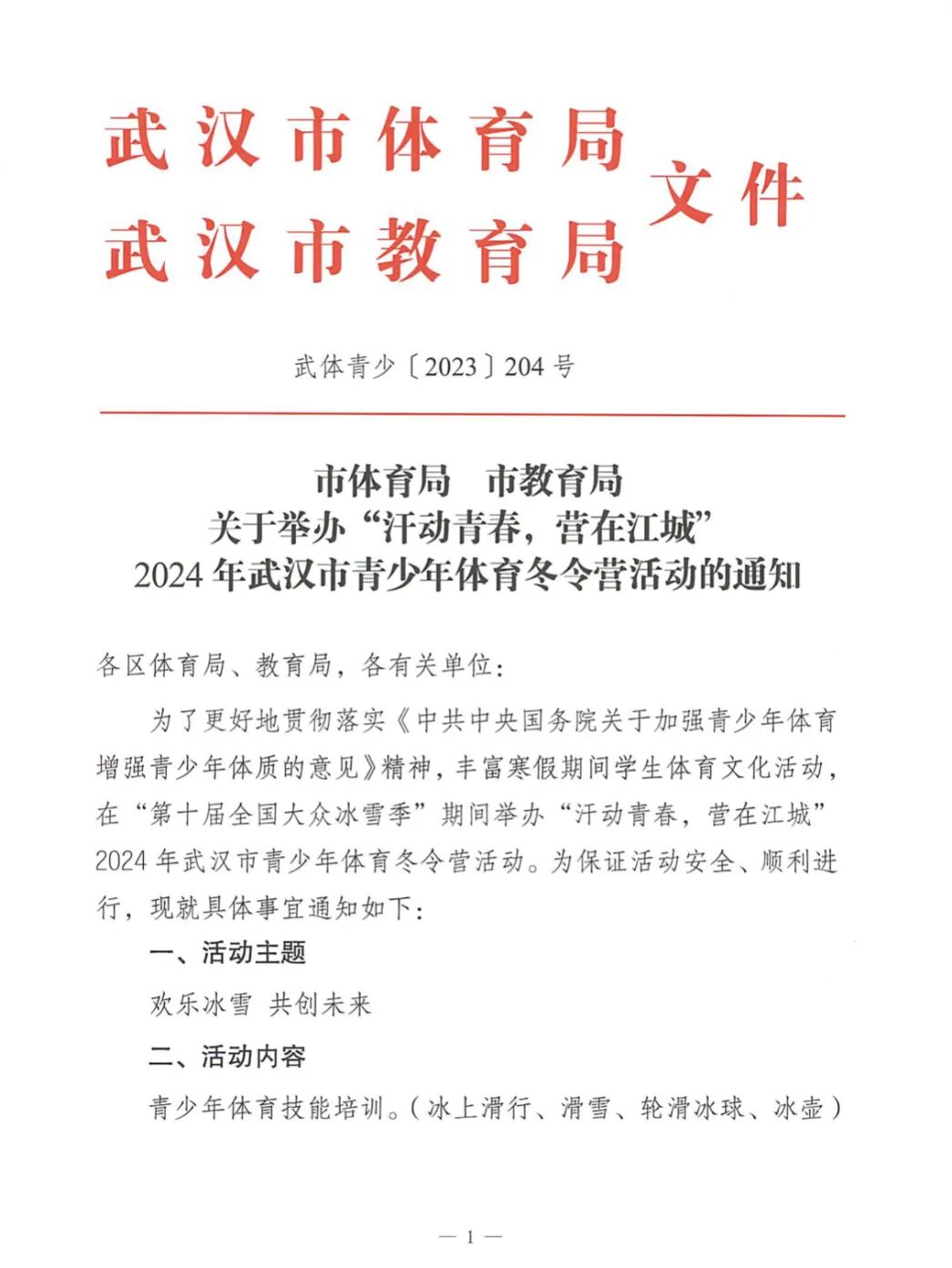 更多详细内容,请点击下方官方文件《市体育局市教育局关于举办“汗动青春,营在江城”2024年武汉市青少年体育冬令营活动的通知》,并放大查看:????