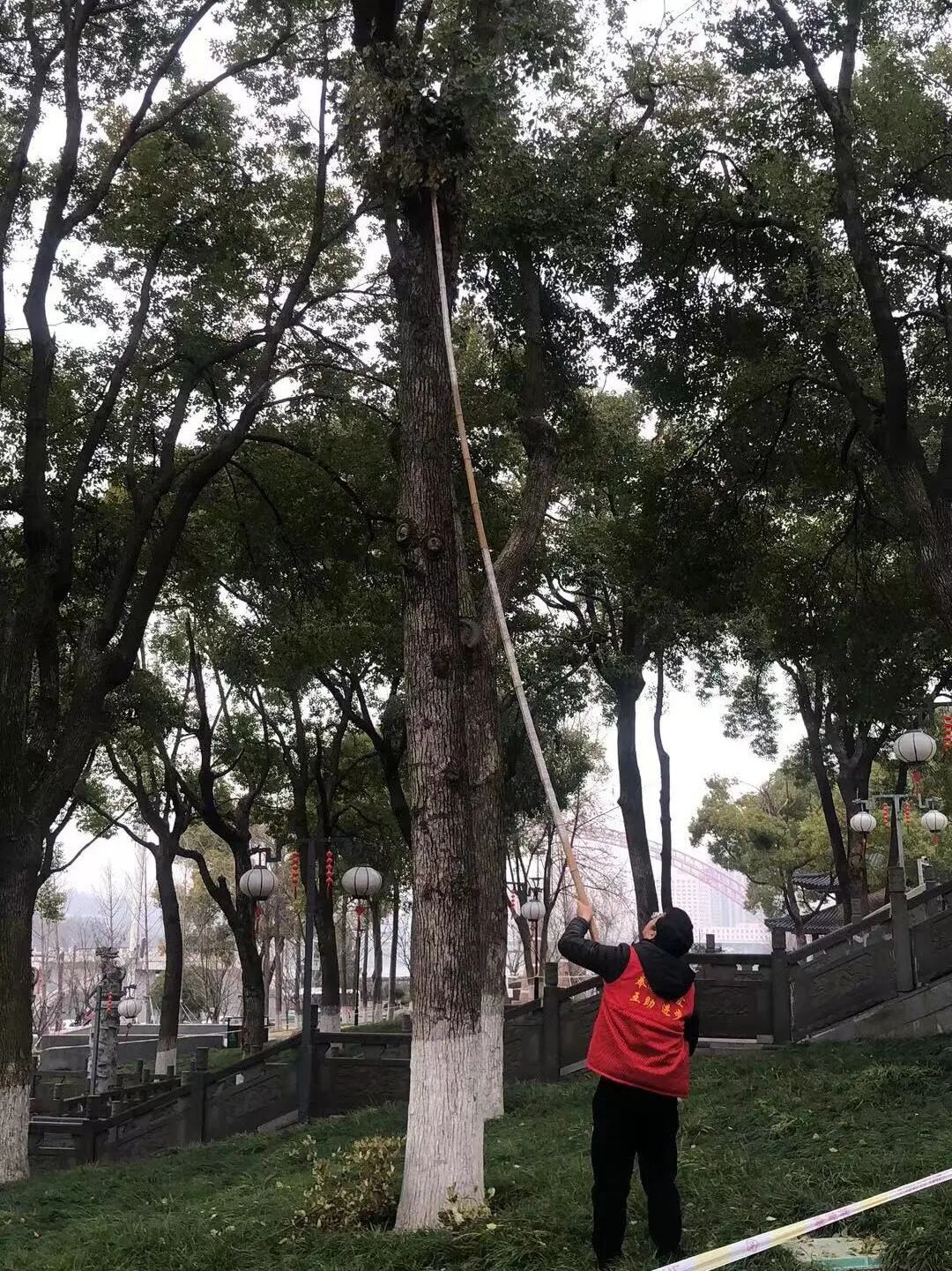 西北湖绿化广场工作人员进行断枝枯枝清理。