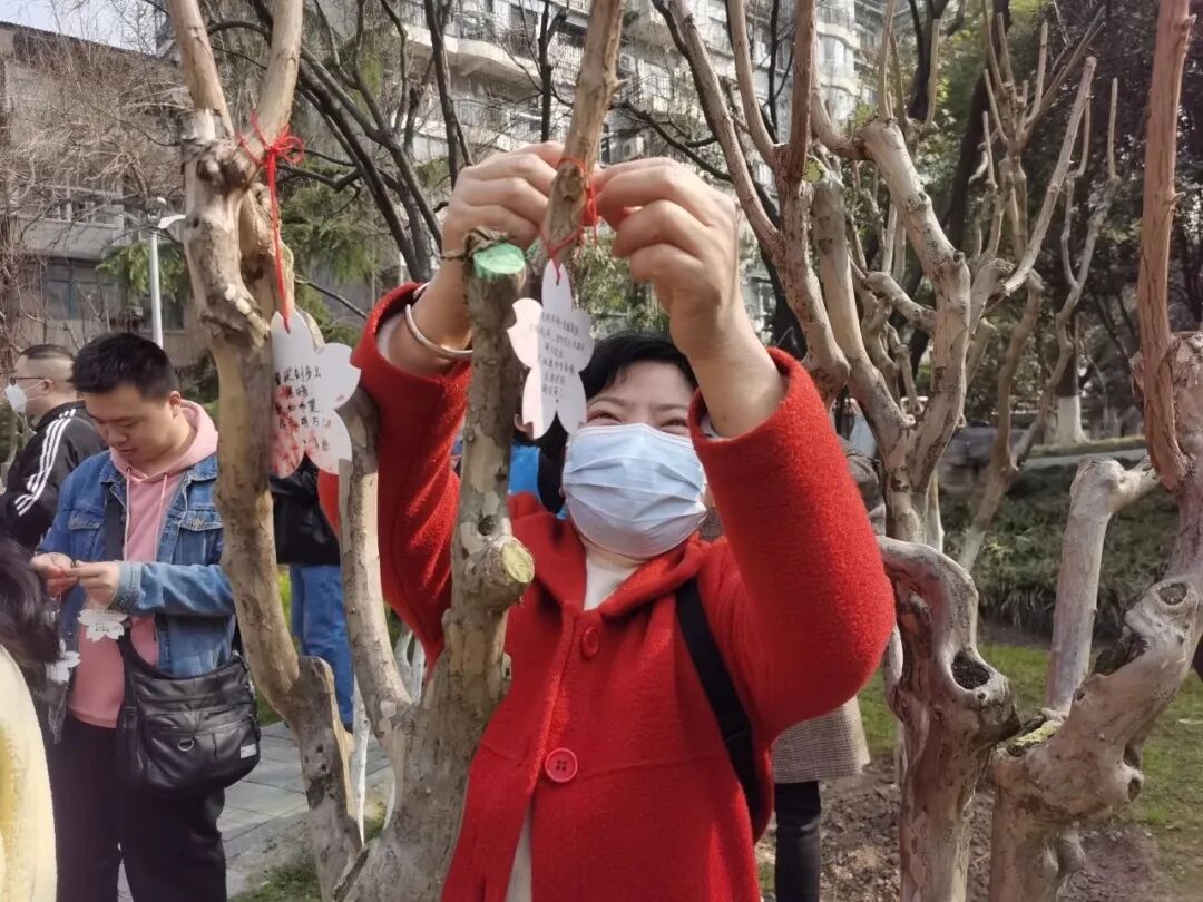 休闲广场上,精神健康科普问答进行得如火如荼。海棠林里,社工组织大家玩起了躯体管理互动游戏。紫薇林里,康复者和游客从社工手里抽取了心灵疗愈卡片,并亲手挂在树上祈福许愿。康复者小王感叹:“这些地方我们都曾经开展过康复活动,树上的鸟窝和防冻漆,都是我们的作品,一次次的活动让我对生活更加充满希望!”