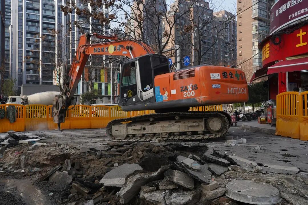 在马场角横路上,几台挖掘机挥舞着铁臂开挖破损的路面,工人们也忙碌地穿梭在工地之间,与挖掘施工紧密配合,对挖掘后的路面碎石碎渣进行清理。