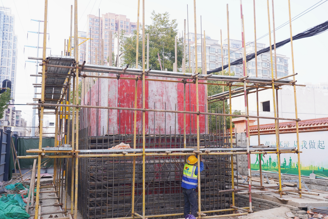 位于新湾四路的一流电网建设工地上,多个工人正在埋头苦干。为了能尽快启动地下顶管顶进工作,目前工人们紧张有序地进行顶管井钢筋绑扎和混凝土护壁施工,力争早日完成顶管井作业。