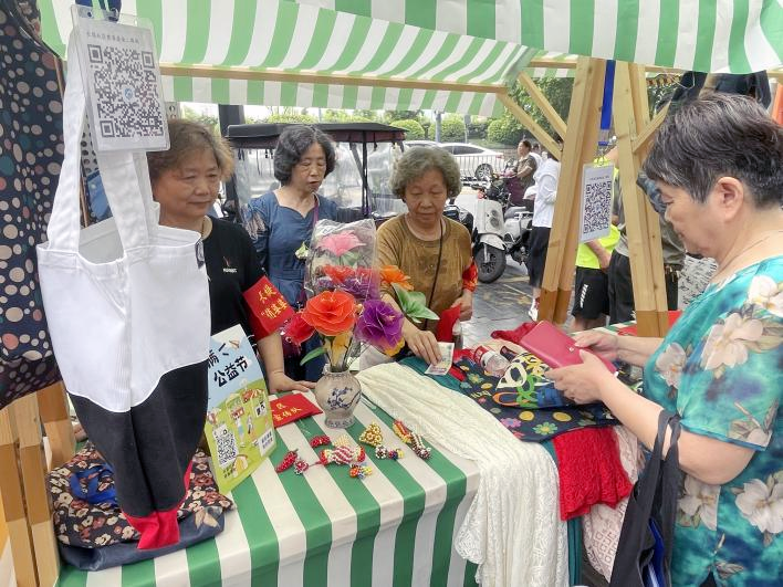 在社区和商户共同打造的集市摊位区,商品琳琅满目,从服饰、饰品到日用品,再到手工艺术品,不仅满足了居民的购物需求,同时也为社区慈善基金筹集了资金。