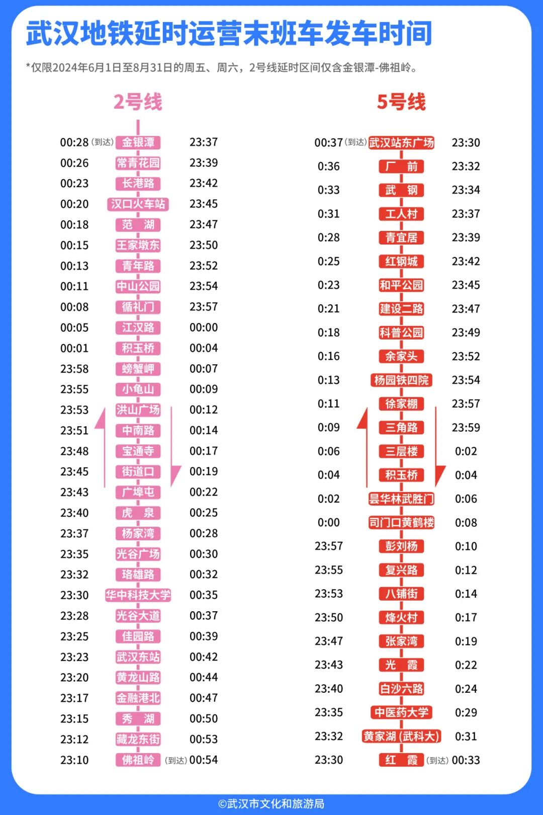 另外,为了方便大家夜间出行,武汉地铁最近推出了贴心的延时运营服务,从6月1日到8月31日,延长地铁2号线、5号线周五、周六运营时间。各站点末班车发车时间如下: