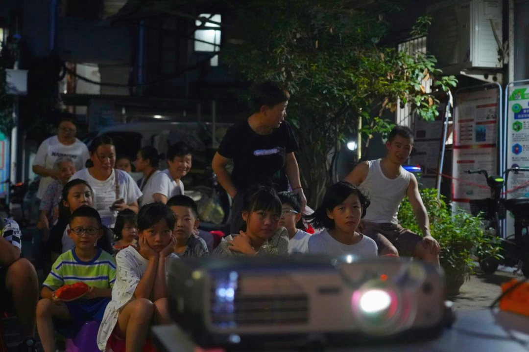每到傍晚,孩子们在广场上嬉戏打闹,摇着蒲扇的爹爹婆婆牵着小孙儿,共享迷人的观影时刻。