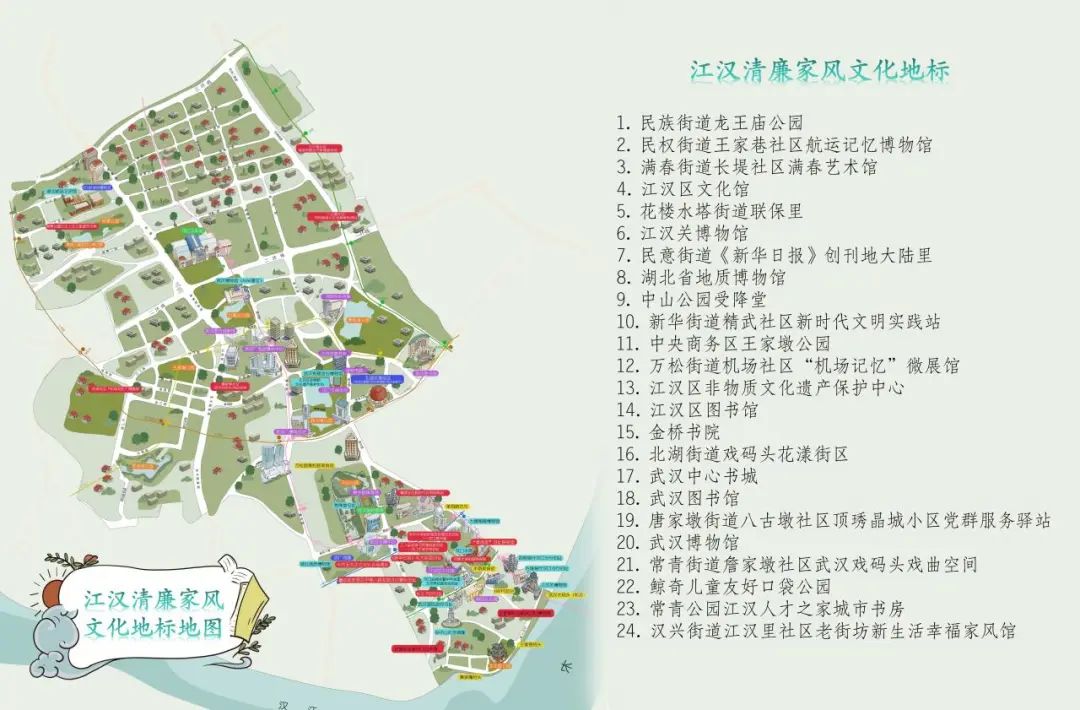 清廉家风存在于家庭,也根植在文化场所。活动中重磅发布江汉清廉家风文化地标地图,民族街道龙王庙公园、江汉关博物馆等24个地标宛若清廉的火种,铺垫了江汉清廉家风文化的底色。