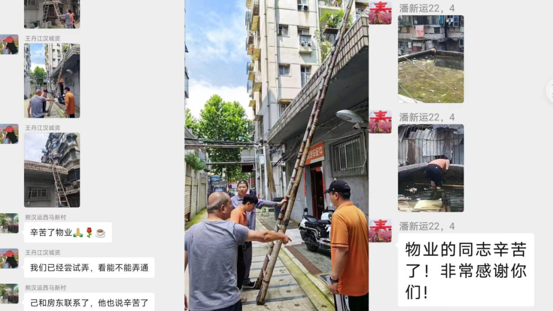 连着几天暴雨之后,一大早,西马新村小区第一党支部书记熊汉运就收到了居民发来的漏水求助,他赶忙在工作沟通群里@江汉城资管家。