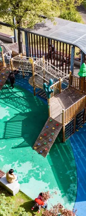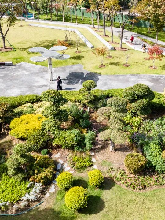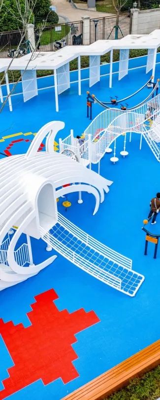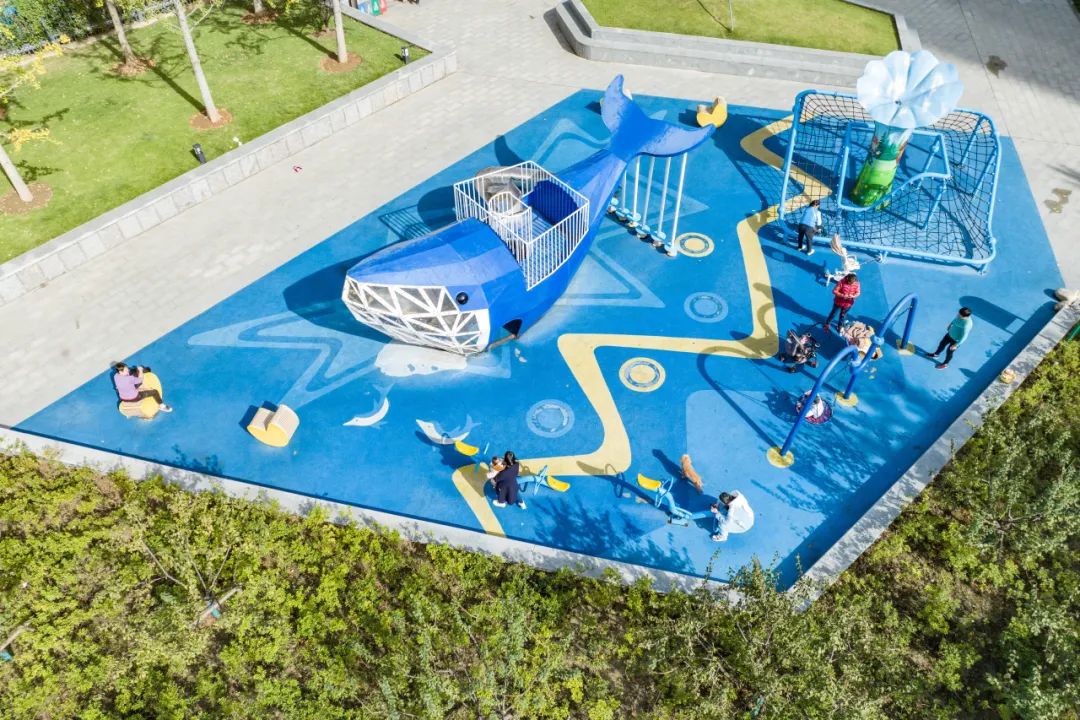 蓝色的“大鲸鱼”游玩设施周边,遛娃的家长们给年轻一辈打了个样。跷跷板、秋千等儿童游乐设施错落其间,使得公园可玩性极高。玩累了到休憩区歇一歇,E人唠唠家常,i人安静小憩,好像又回到了小时候的大院时光。
