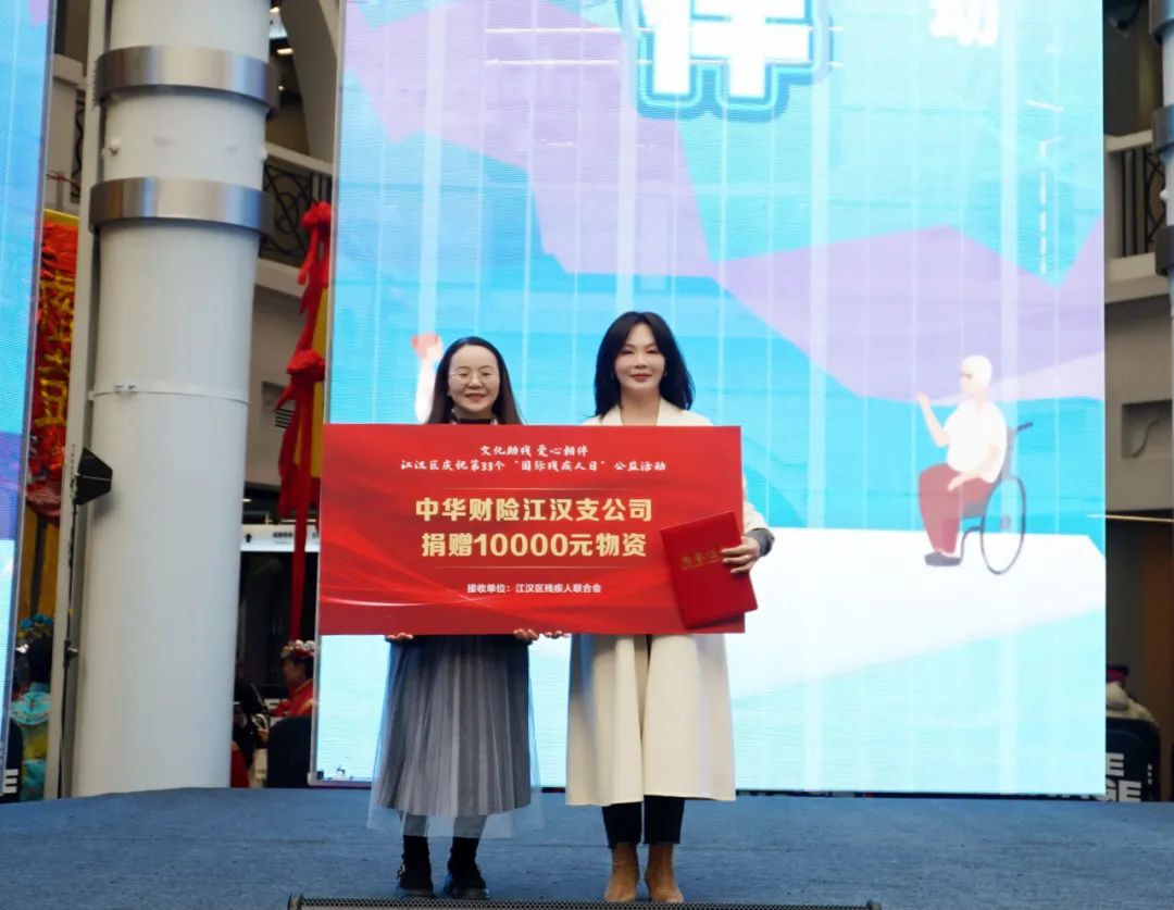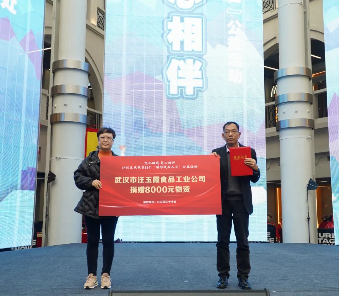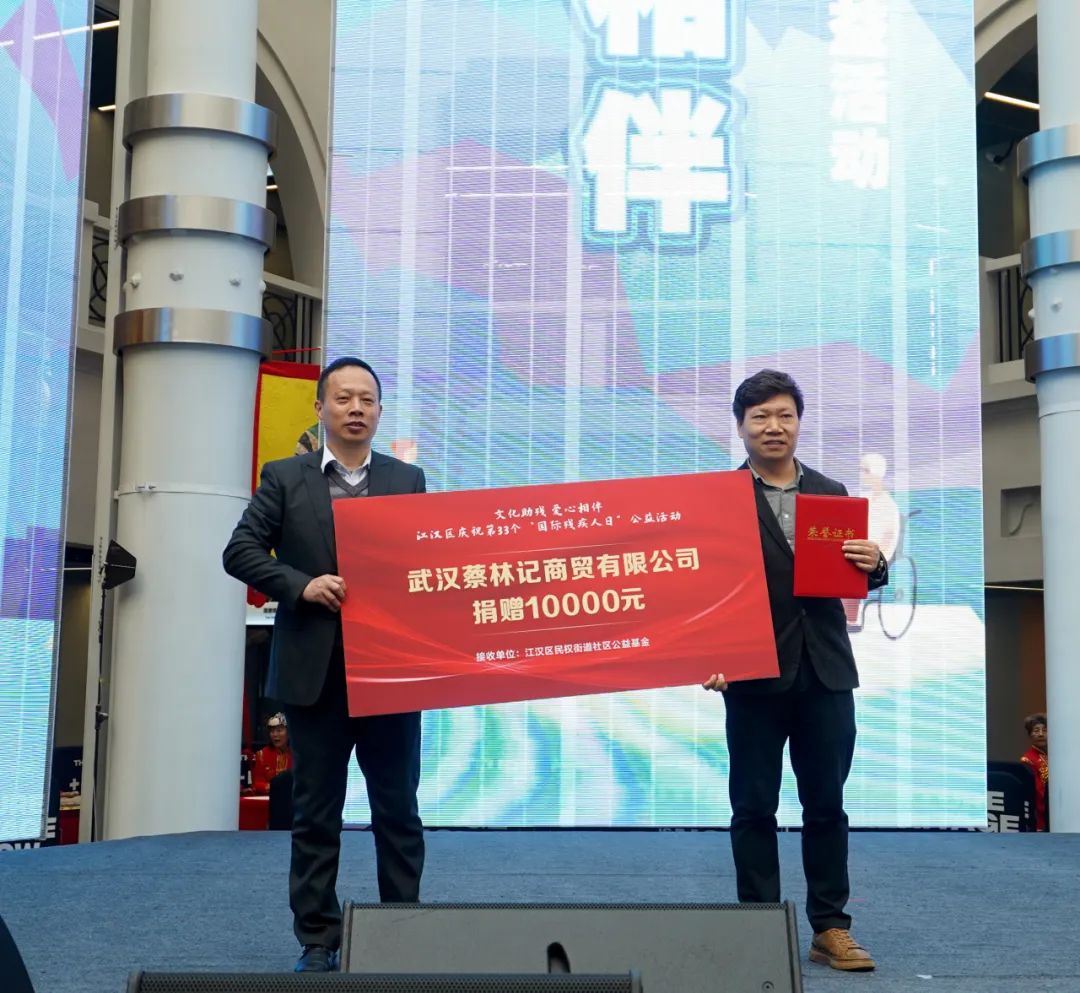 活动中,爱心企业中华财险江汉支公司、武汉市汪玉霞食品工业公司、武汉蔡林记商贸有限公司还分别向江汉区残疾人联合会、江汉区红十字会、民权街道社区公益基金捐赠了物资和善款。