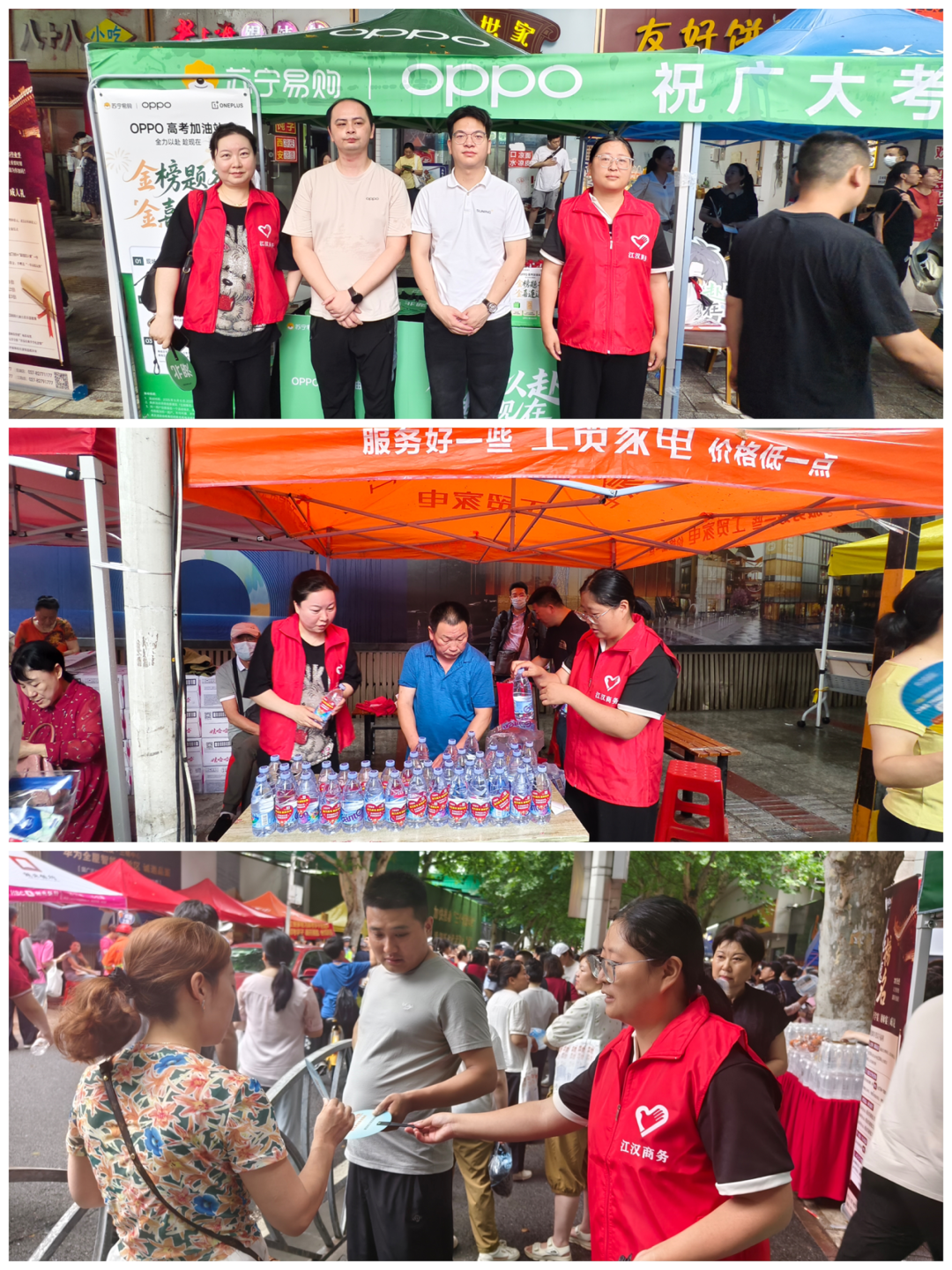 第六十八中学考点外,区商务局联合附近大型商贸企业,共同助力高考。区商务局、工贸家电航空路店、苏宁易购中山店携矿泉水、小凉扇在考点门口支起帐篷,搭建服务区免费提供饮水、座椅等,为即将走进考场的学子及在外等候的父母送去清凉关怀。