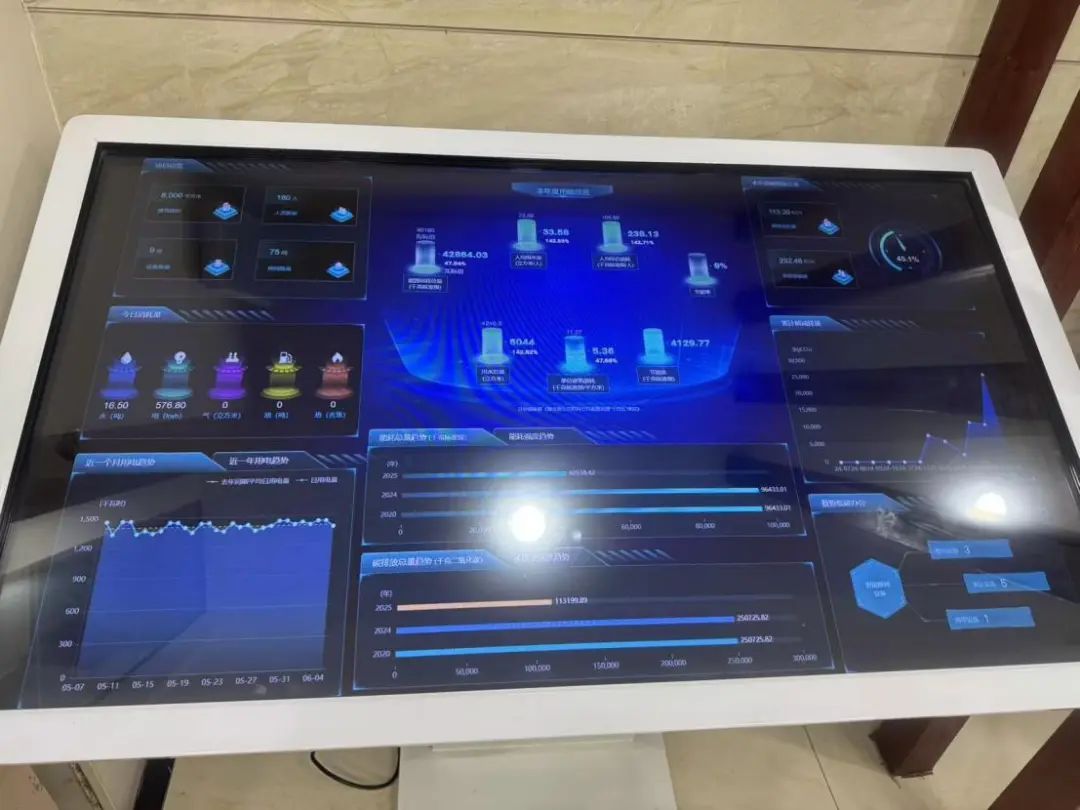 “大家现在看到的就是我们花楼水塔街道的能源资源管理平台,它能够利用物联网、AI与大数据等先进技术,对水、电等能源资源消耗量进行实时数据采集和碳排放量实时核算,实现能耗的精细化管理”。现场讲解员为现场领导、嘉宾讲解了街机关低碳改造的相关成果。