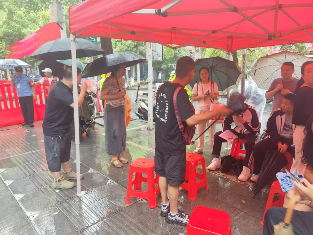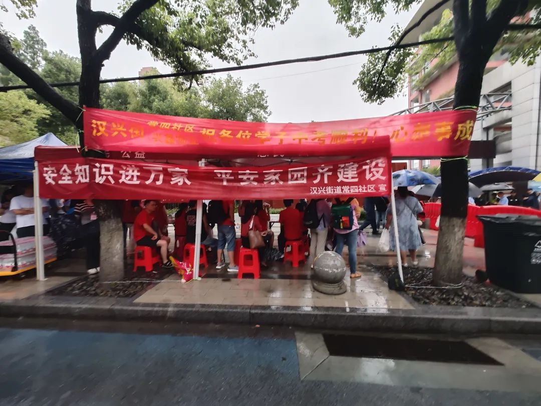 针对周边考生及家长在中考期间的切实需求,汉兴街道常四社区预先准备了避雨帐篷、饮用水、休息座椅等物资,在大雨天气中搭建起“暖心驿站”。