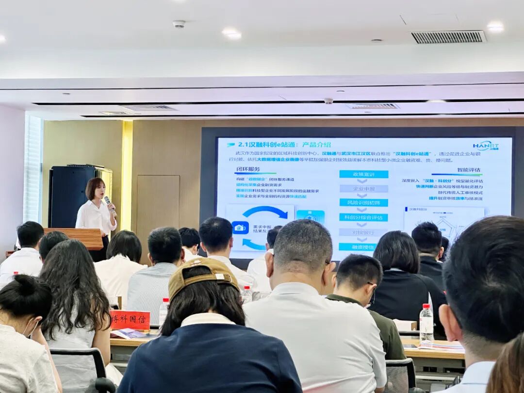 作为该生态体系的核心载体,“汉融科创e站通”平台由江汉区与汉融通公司联合打造,首创“汉融科创分”企业量化评估模型,依托大数据构建企业精准画像,并将评分全流程嵌入银行信贷系统,实现融资审核的智能化、数据化革命。武汉农商行作为首家试点银行,可实时查看企业科创评分,精准研判融资风险与潜力,极大提升授信审批效率与科学性。
