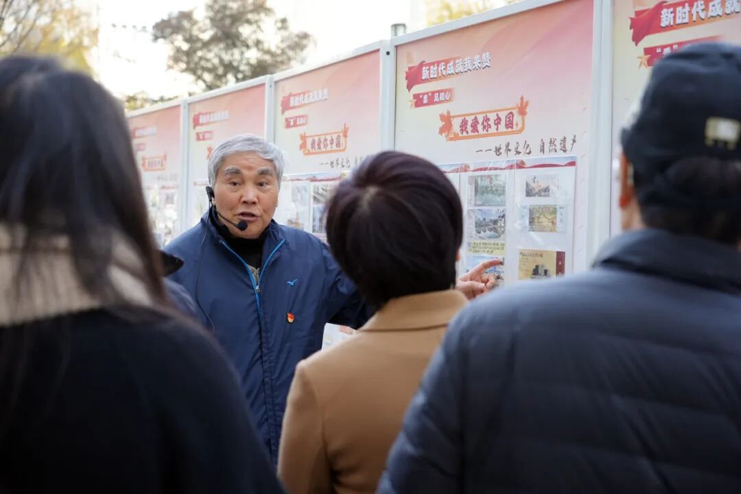 在“新时代成就我来赞”展区,“镜”彩蝶变摄影展前围满了观众。一组组新旧对比的照片,记录着戏码头街区从老旧巷陌到文化地标的华丽转身。“票”见初心展览中,“门票爷爷”周嘉谋正向观众讲述红色门票背后的城市记忆与更新:“每一张门票,都是一段红色记忆,见证着我们的城市在党的领导下发生的翻天覆地变化。”